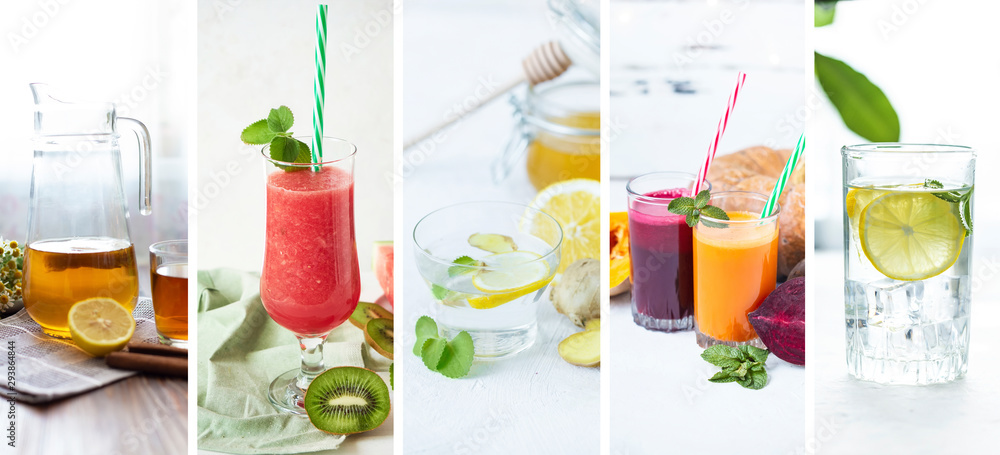Food collage from photo of healthy drinks. Kombucha, ginger drink, smoothie, lemonade, freshly juices
