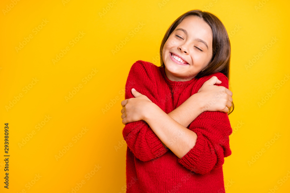 Portrait of peaceful calm kid hug embrace herself enjoy warm soft comfy sweater pullover wear red stylish lifestyle clothes isolated over yellow color background