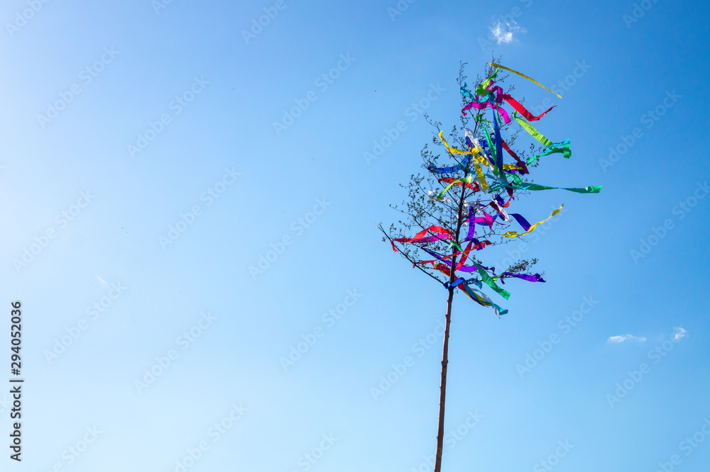 May tree, traditional hungarian austrian german folklore decoration in may with blue sky