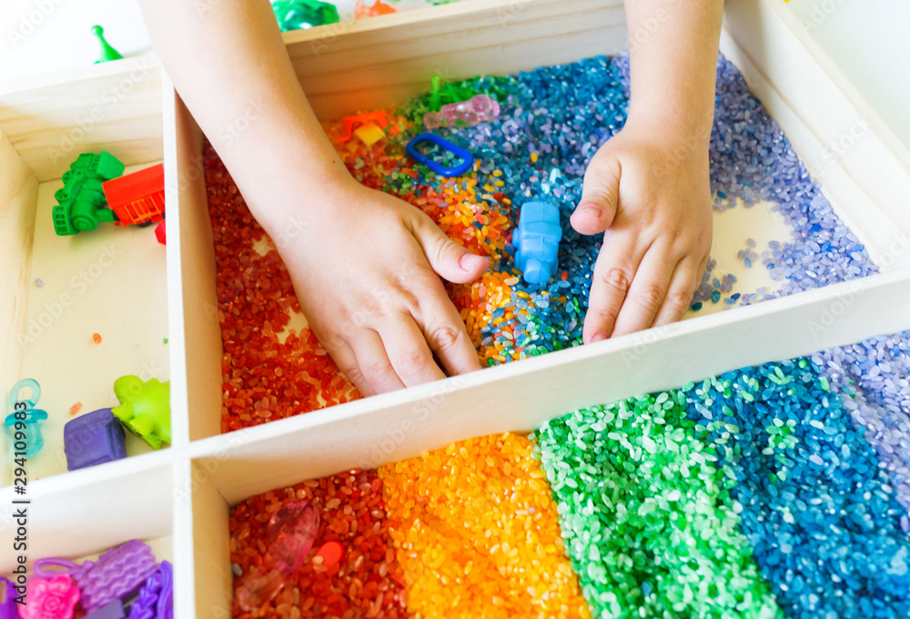 Sensory box with rainbow rice inside. Montessori material baby