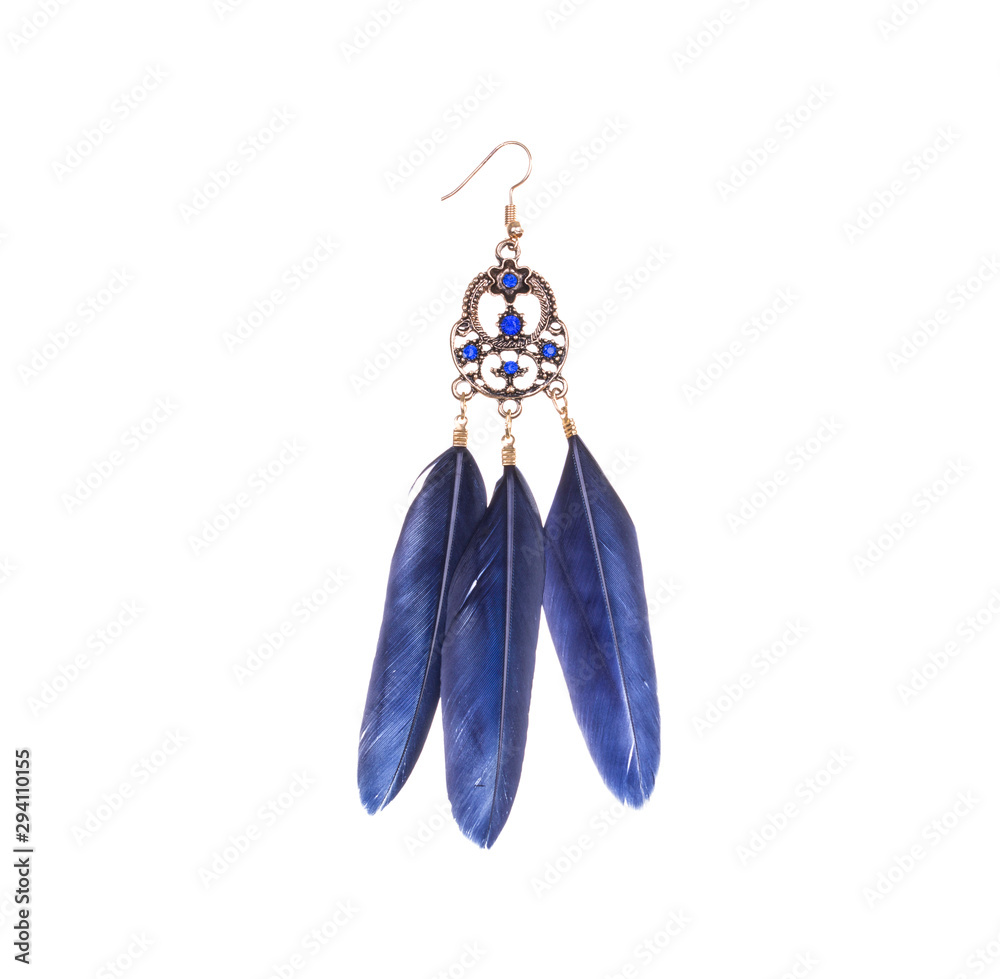 blue stones on silver ornamented earring pendant with blue three feathers, isolated on white background