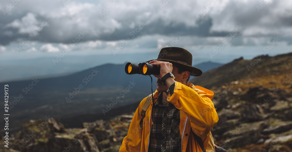 traveller got lost, her is looking for a path in the evening. close up side view photo. copy space.
