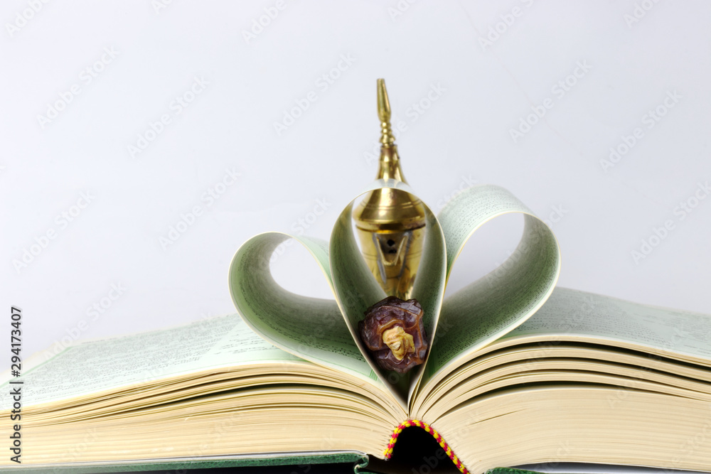 Close up of tasbeeh and Quran, the holy book of islamic religion