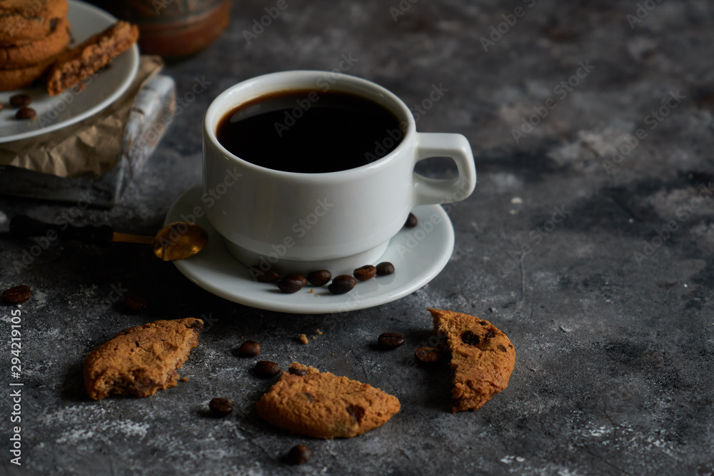 Cup of black strong coffee with coffee beans and cookies on dark background