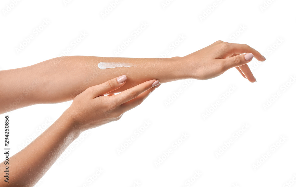 Female hands with cream on white background