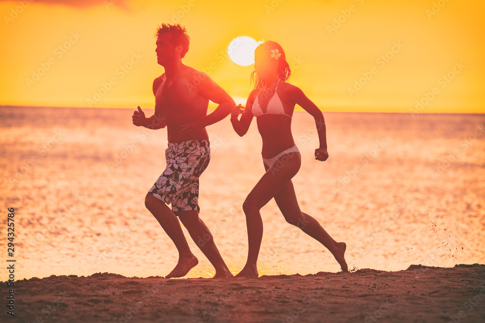 Running couple silhouettes athletes woman and man jogging together on beach training cardio outdoors. Travel vacation fitness sport.