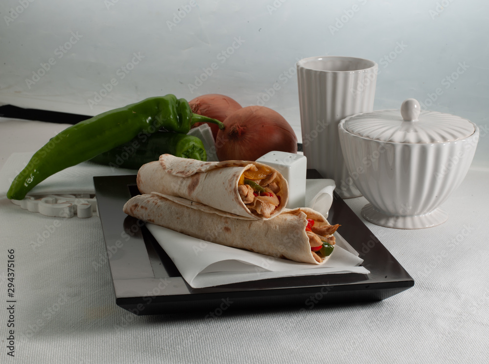 Burritos con condimentos, cebollas y pimientos. Burritos with condiments, onions and peppers.
