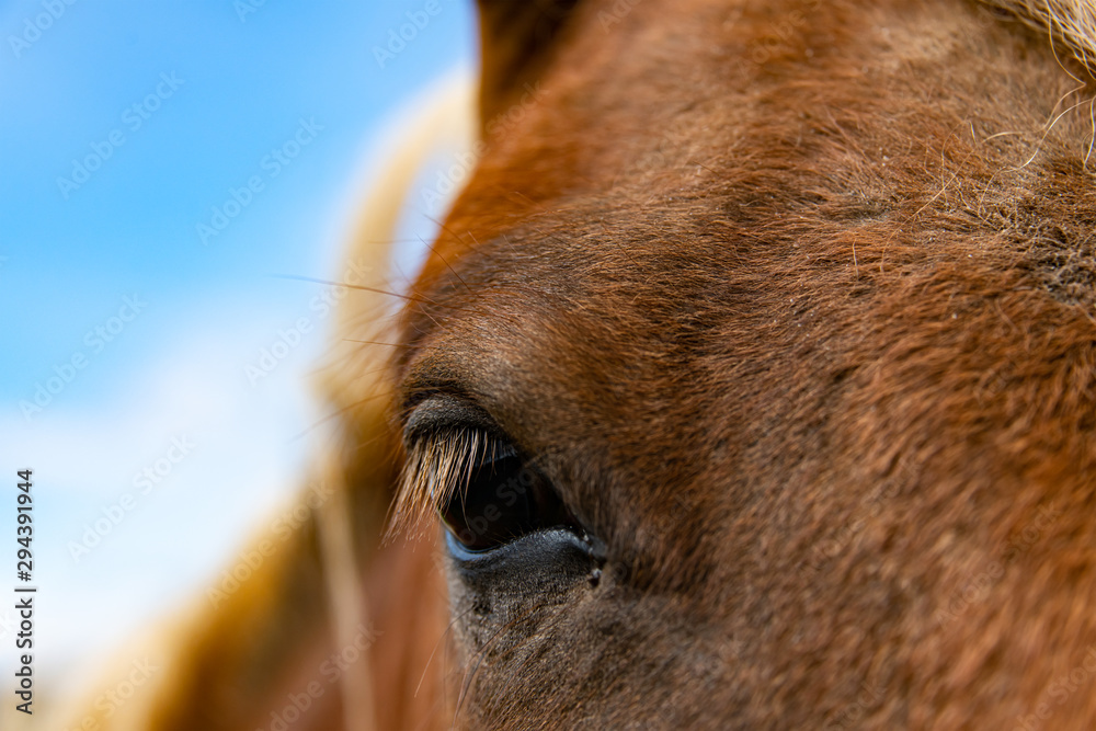 Islandpferd Auge Island Pony Nahaufnahme braun Wimpern Fell braun Fuchs Mähne Blick Treue Fluchttier Iceland typisch Herde reiten Gangarten Tölt Reiter Stall Weide Freiheit Natur Wildnis robust Kälte