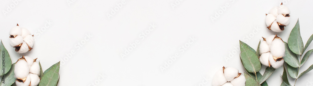 Flat lay flowers composition. Frame made of cotton flowers and fresh eucalyptus twigs on light gray background. Top view, copy space. Delicate white cotton flowers. Floral background, greeting card