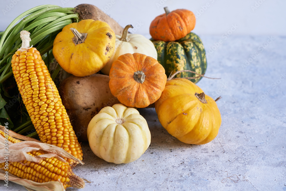 Autumn harvest of vegetables. pumpkin, radish, corn