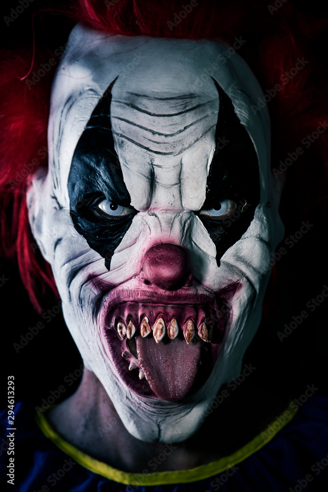 scary evil clown sticking out his tongue