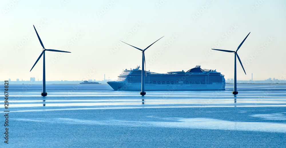 A large cruise ship passes offshore wind turbines near the Oresund Bridge between Denmark and Sweden