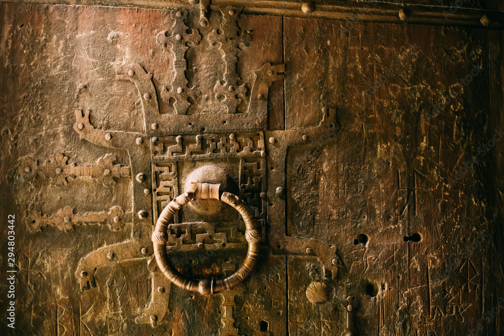 Borgund, Norway. Carved Details Of Famous Wooden Norwegian Landmark Stavkirke. Ancient Old Wooden Triple Nave Stave Church. Close View, Door Details