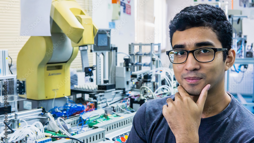 A young Malay engineering student with spectacles working in the lab and thinking by holding chin.