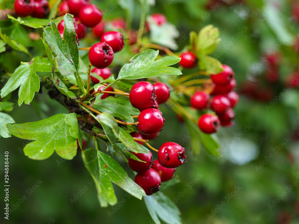Red hawthorn (Crataegus) berries and green leaves in a hedgerow