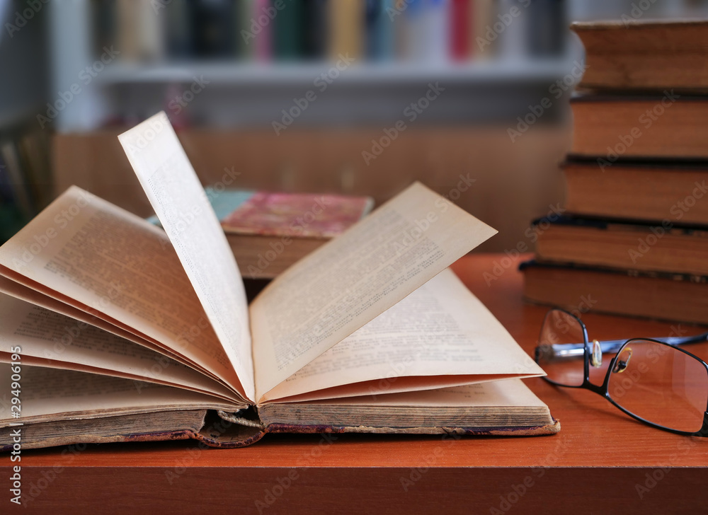 Open old book and glasses on the table, stack of old books and bookcase in the background