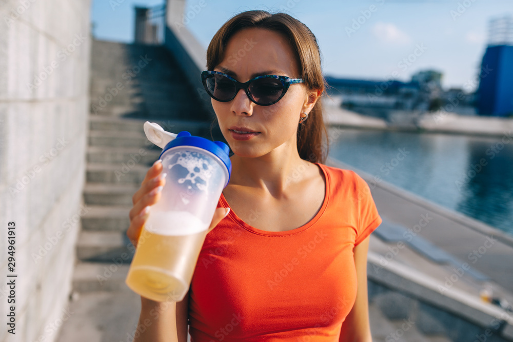 Amino Acid or bcaa of shaker. Young woman drink sportive nutrition