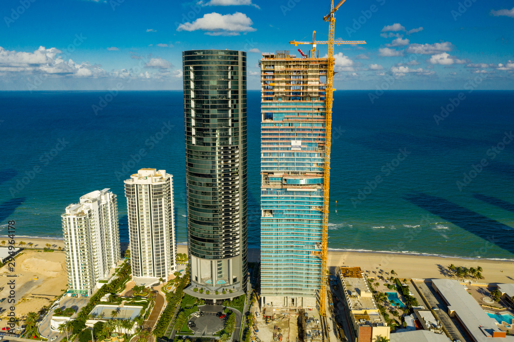 Aerial photo Porsche Design Tower and Turnberry Ocean Club luxury highrise condominiums on the beach