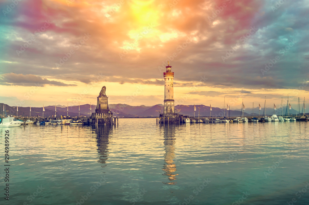Beautiful evening seascape with lighthouse in harbor of Lindau