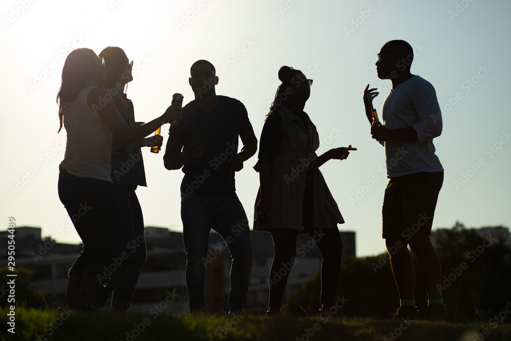 Diverse team of friends having fun at outdoor party. Silhouettes of multiethnic men and women holding beer bottles and dancing on grass. Celebration concept
