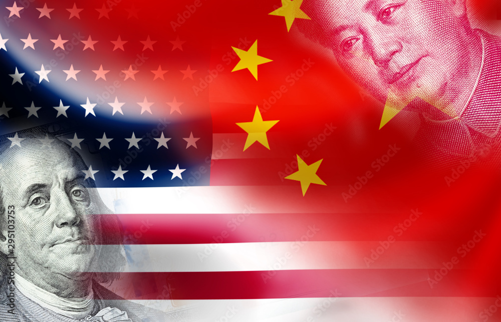 USA and China flag on coins and stock market chart .It is symbol of economic tariffs trade war and tax barrier between United States of America and China.