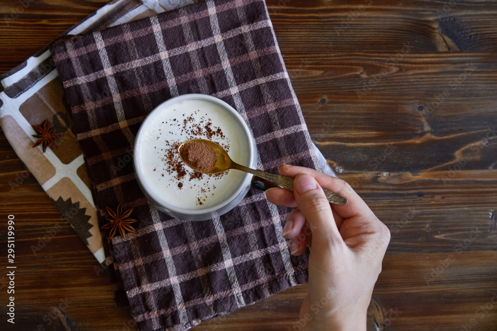 female hand sprinkles cappuccino with cinnamon Copyspace