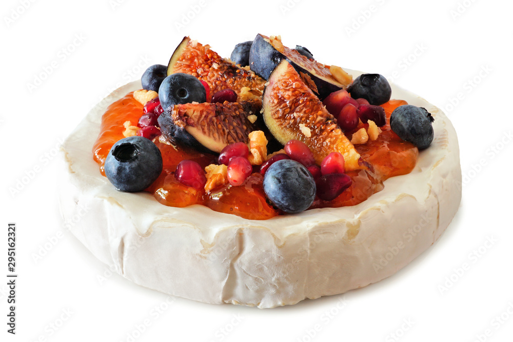 Baked brie appetizer topped with figs and jam, blueberries, pomegranates and nuts. Side view isolated on a white background.