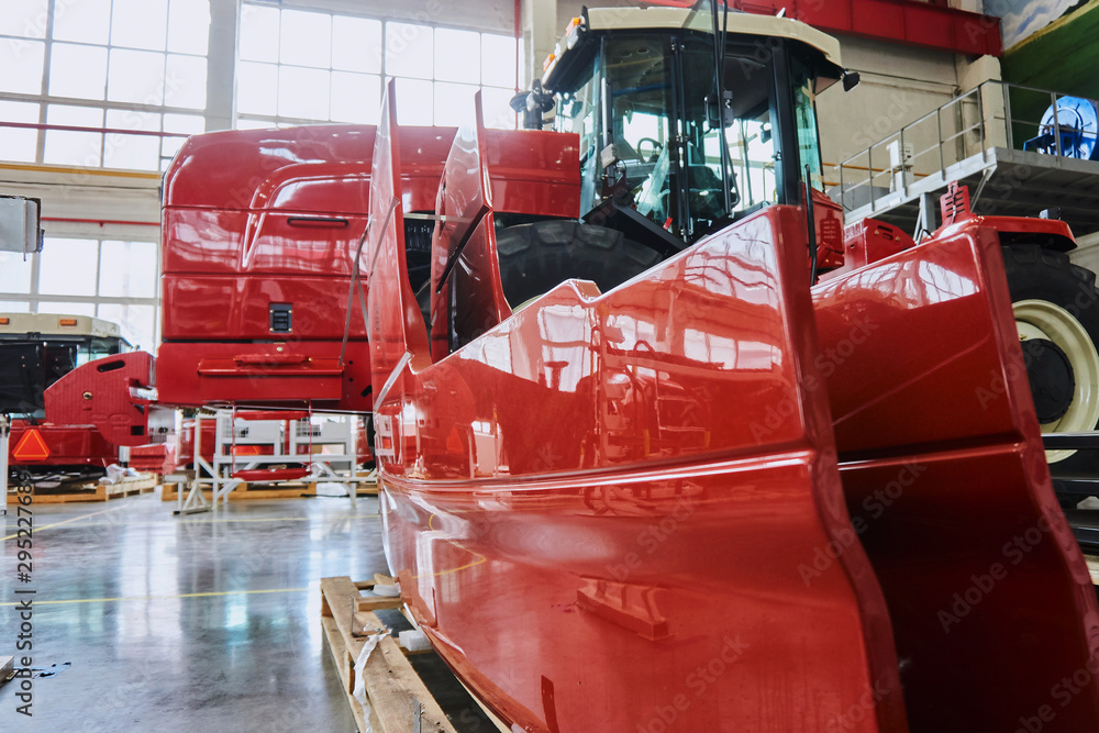 New details of polished red for a modern tractor body are in the workshop for collecting equipment at the final stage of work.