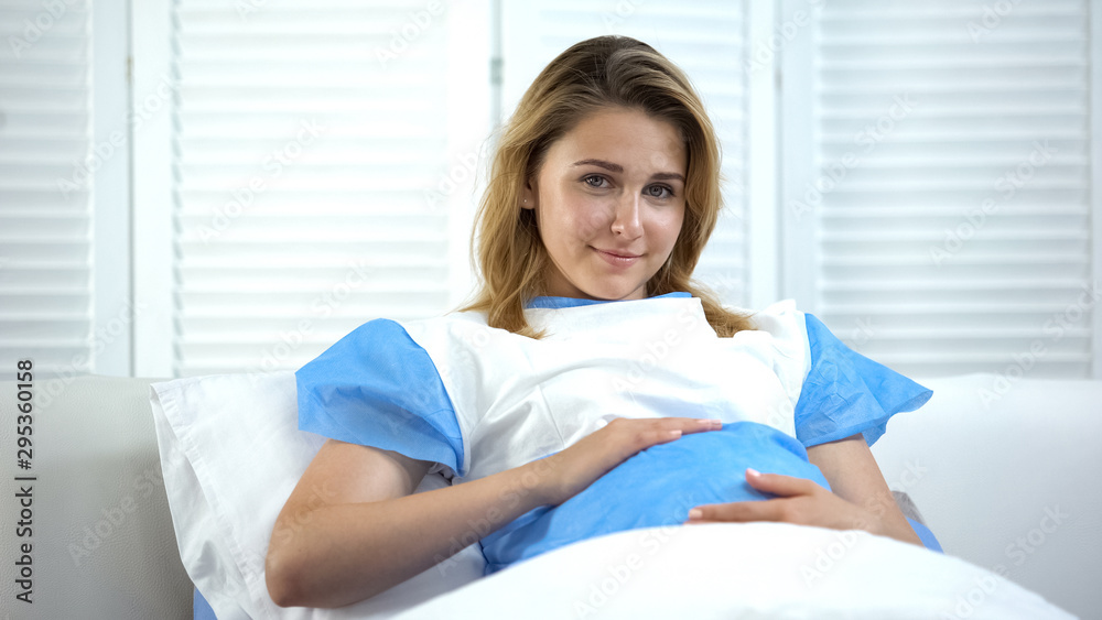 Beautiful pregnant woman holding tummy and smiling at camera, prenatal care