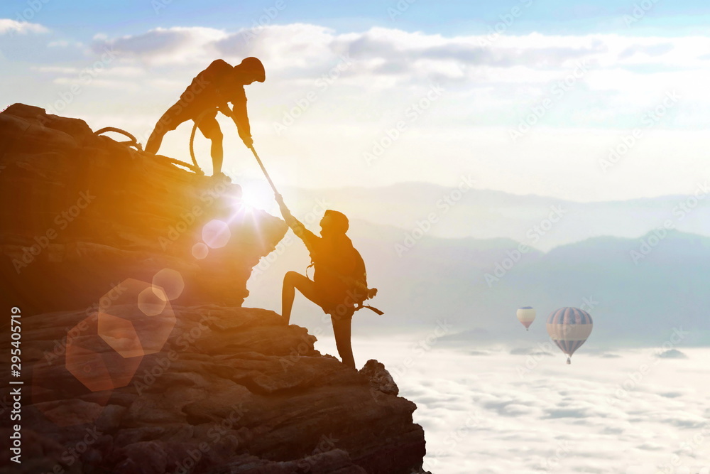 Climbing team are on the climb to the cliff,hiking and team work concept. Mountaineer climbing a steep cliff.