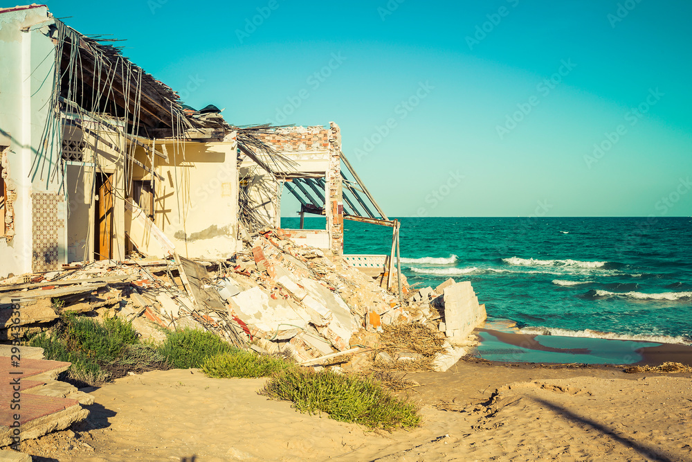 destroyed building on the beach after a storm due to strong waves. Climate change