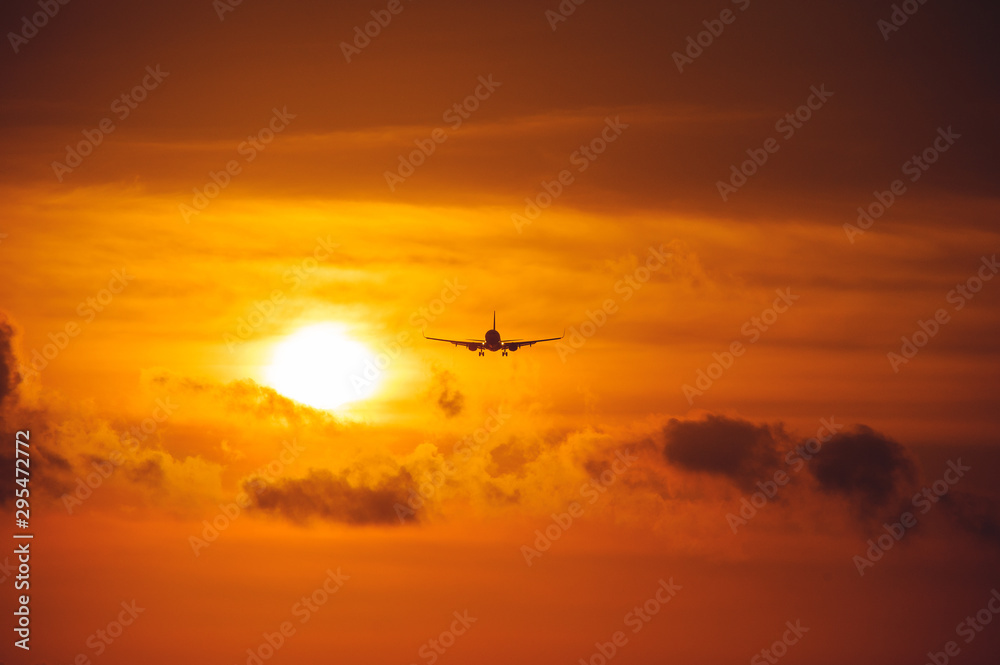 Silhouette of a passenger airliner in the sky during sunset. Airplane in the sky.