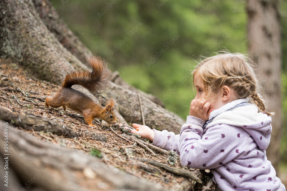 Mädchen füttert Eichhörnchen mit einer Haselnuss, Europäisches Eichhörnchen (Sciurus vulgaris)