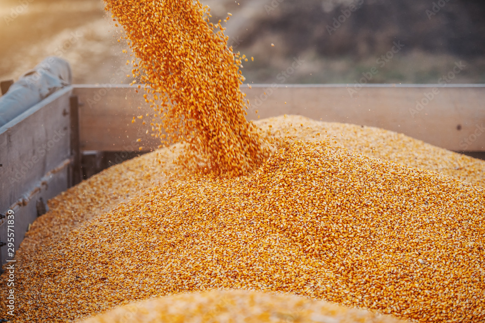 Machine for separating corn grains working on field and filling tractor trailer with corn. Autumn time. Husbandry concept.