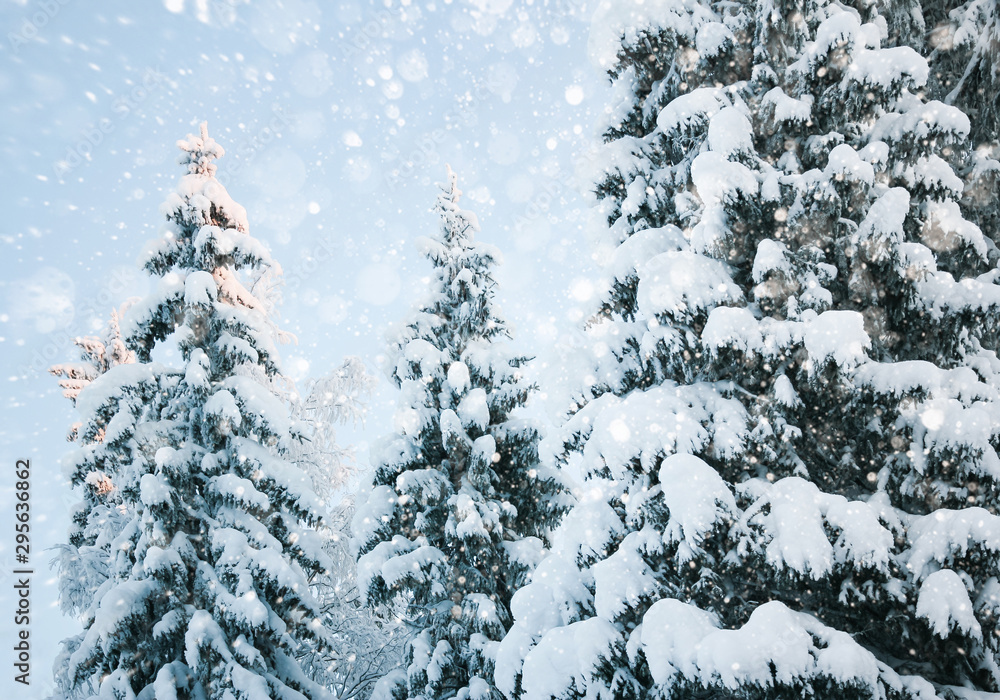 Beautiful winter landscape, forest trees, pines and firs covered with snow against the sky.
