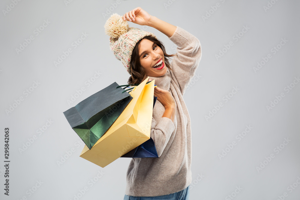 christmas, seasonal sale and consumerism concept - happy smiling young woman in knitted winter hat and sweater with shopping bags over grey background