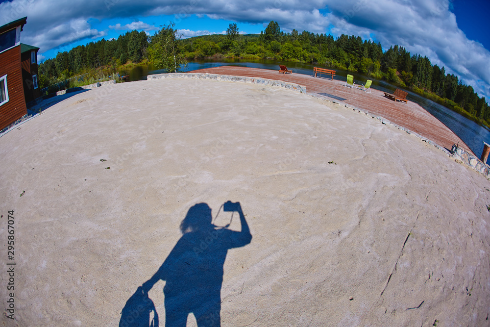 the sandy surface of the beach games area is formed by bright daylight on which the shadow of the silhouette of the photographer who photographed himself falls.