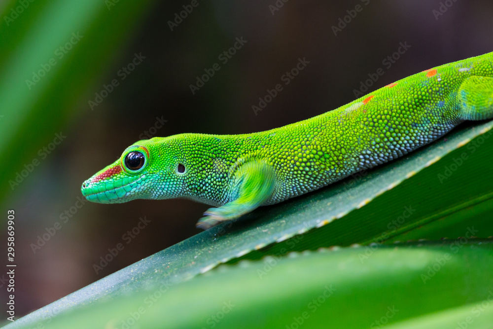 green Madagascar giant day gecko (phelsuma grandis) on leaf