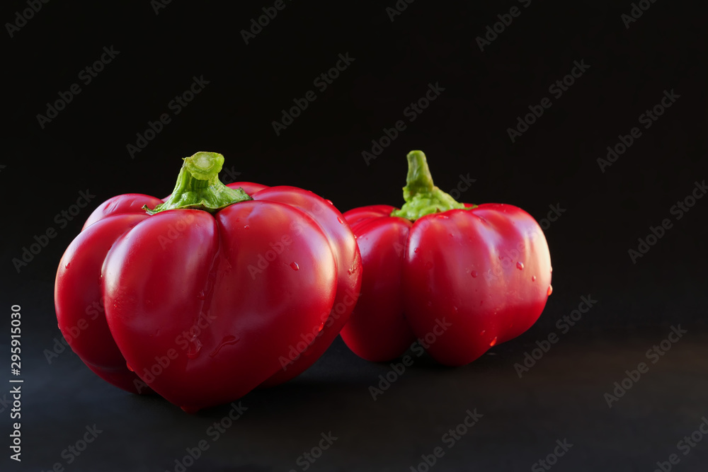 Two Round of Hungary sweet peppers, specialty pimento cheese are ribbed, flattened peppers of intense red with very thick, sweet, delicious flesh. Whole paprika peppers over dark background.