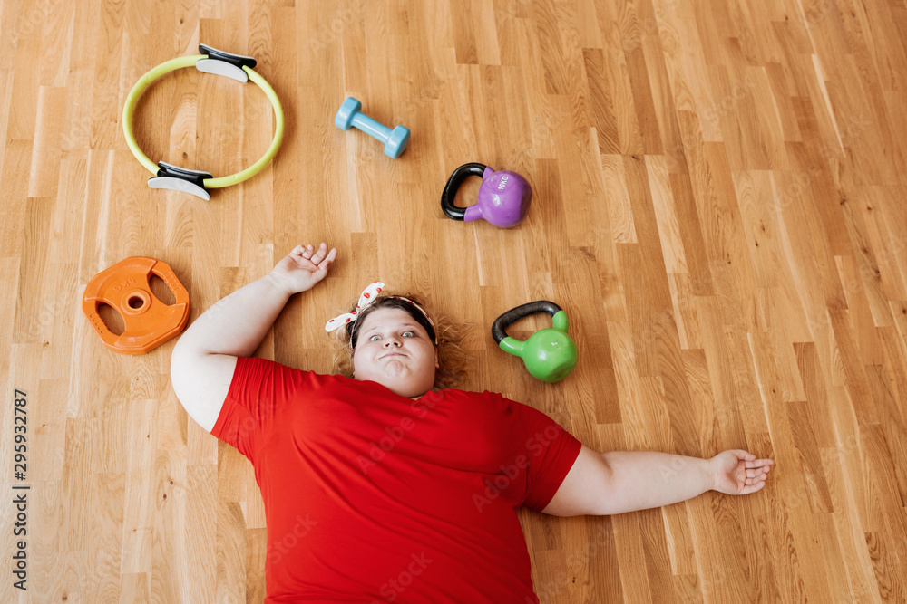 Tired fat girl dressed in the sportswear and with a bandage on her head is laying on the floor next to the sports equipment