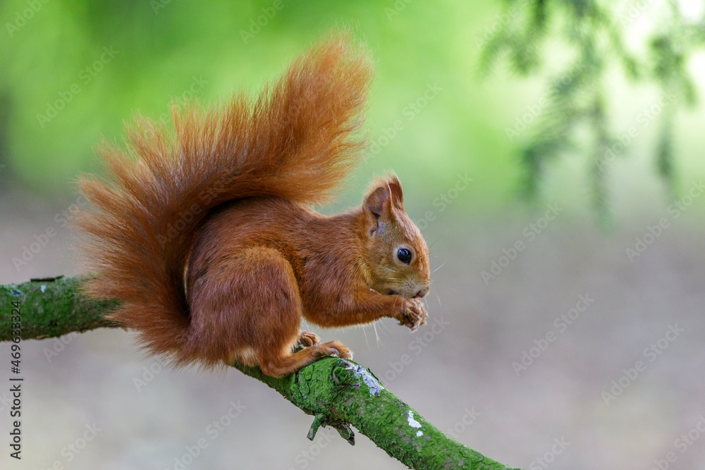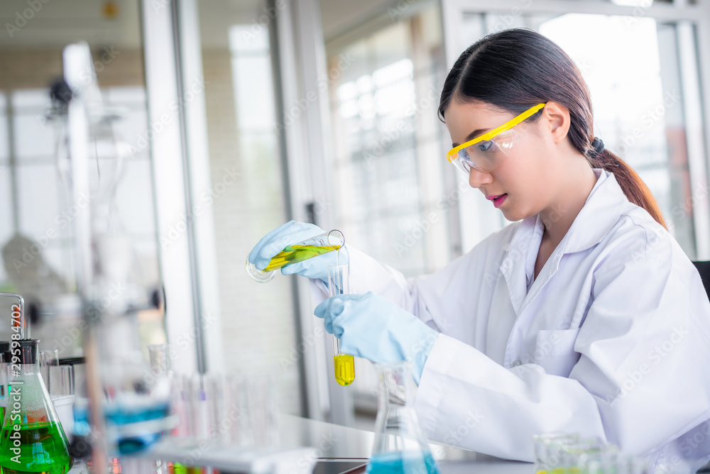 Attractive scientist woman looking chemical sample in flask at laboratory with lab glassware background. Science or chemistry research and development concept.