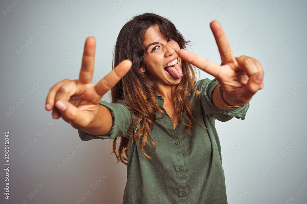 Young beautiful woman wearing green shirt standing over grey isolated background smiling with tongue out showing fingers of both hands doing victory sign. Number two.