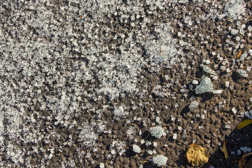 Small fragments of shattered glass on an empty asphalt road as a background