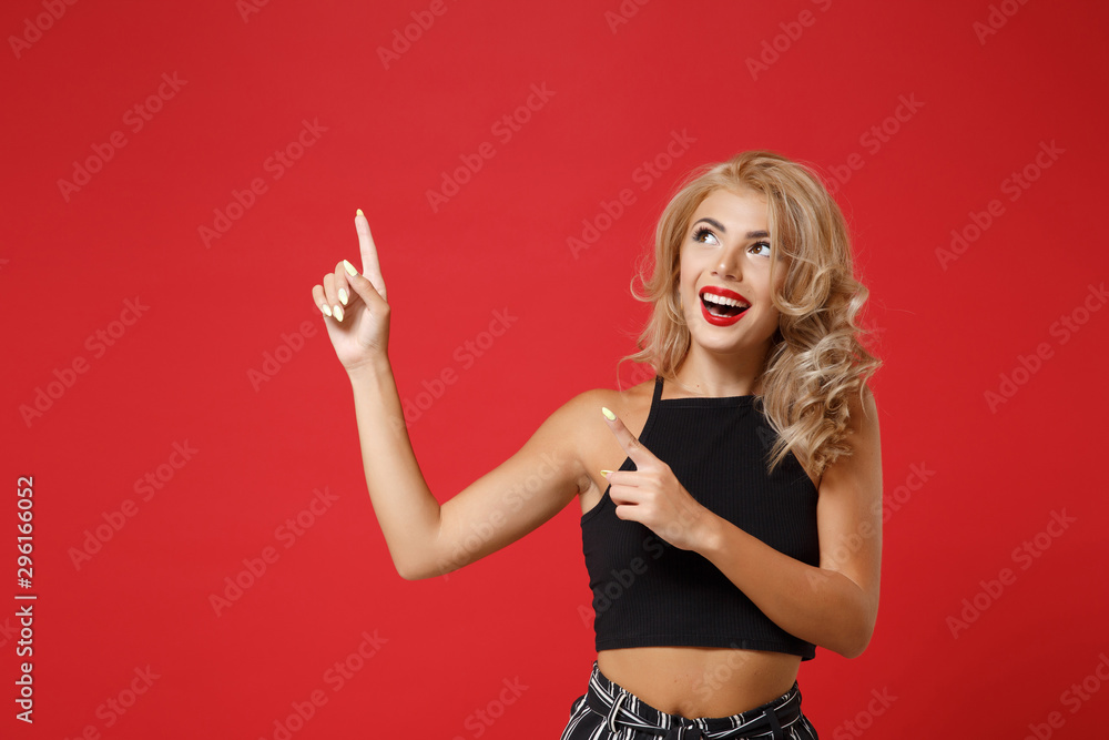 Excited cheerful young woman girl in black clothes posing isolated on bright red background, studio portrait. People sincere emotions lifestyle concept. Mock up copy space. Pointing index fingers up.