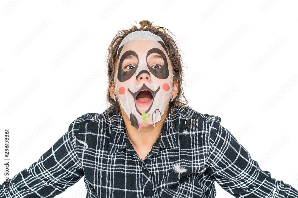 Young teenage girl with facial panda mask looking at camera isolated on white background. Cosmetic procedure. Beauty spa and cosmetology.