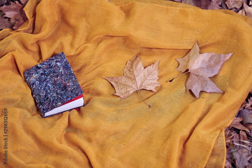 Yellow handkerchief on dry brown leaves with a notebook on top.