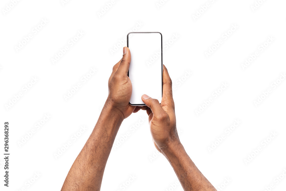 Black man's hands holding cellphone with blank screen, taking photo