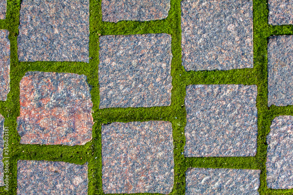 old gray red granite stone pavement made of square stone bricks with sprouted green moss. rough surface texture