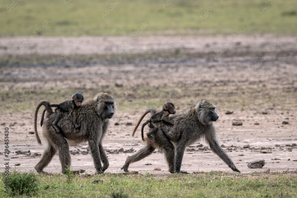 Two mother baboons, each with babies riding on their backs. Image taken in the Maasai Mara, Kenya.