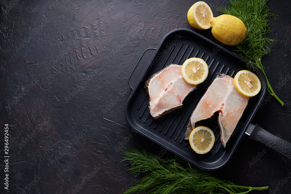 Fresh fillet of sea fish in a grill pan Copy space On dark background.
